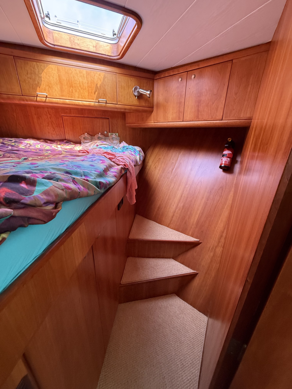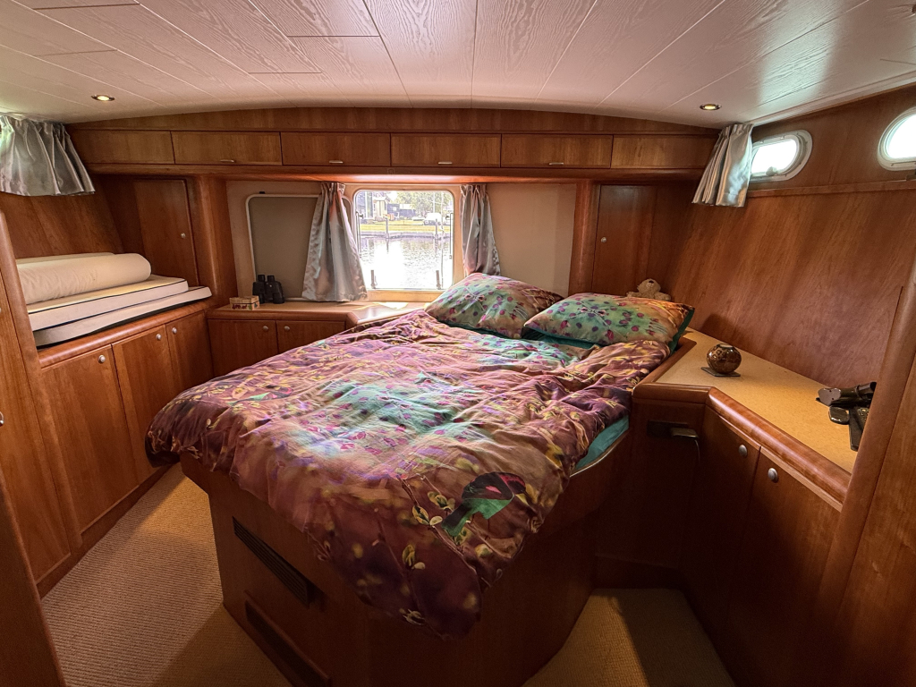 In het achterschip is de riante eigenaars hut met enorm veel kastruimte. Ook is hier de natte cel geplaatst met een aparte voorziening voor het douchen, zodat niet alles nat wordt. Een fraai schip van erg hoge kwaliteit in een uitmuntende staat van onderhoud. Voorzien van enorm veel kostbare en praktische opties. Direct klaar voor een vakantie of zelfs wonen aan boord.