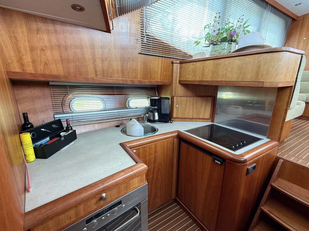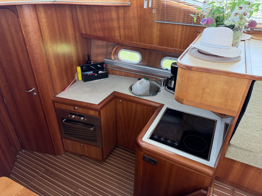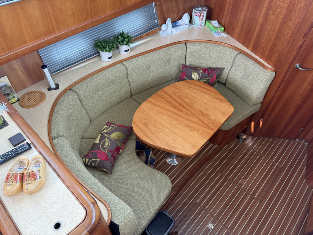 In het voorschip is een hele mooie dinette geplaatst met daartegenover een ruime en luxe keuken. Alles is hier aanwezig, van afzuigkap tot en met een nog ongebruikte combi magnetron aan toe. Koken gebeurt op een 4-pits elektrisch fornuis, dus geen gas aan boord. In plaats daarvan een ultrastille 6Kva Mastervolt generator. Verder in het voorschip is een ruim gastenverblijf met een 2-persoons bed en een eigen toiletruimte.