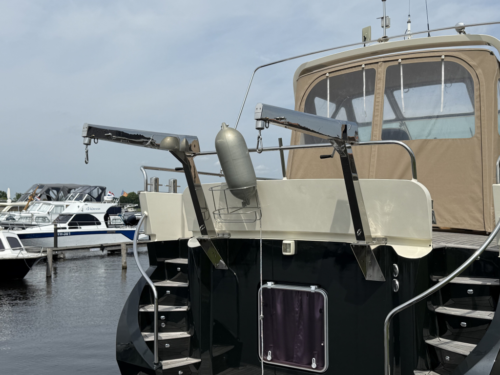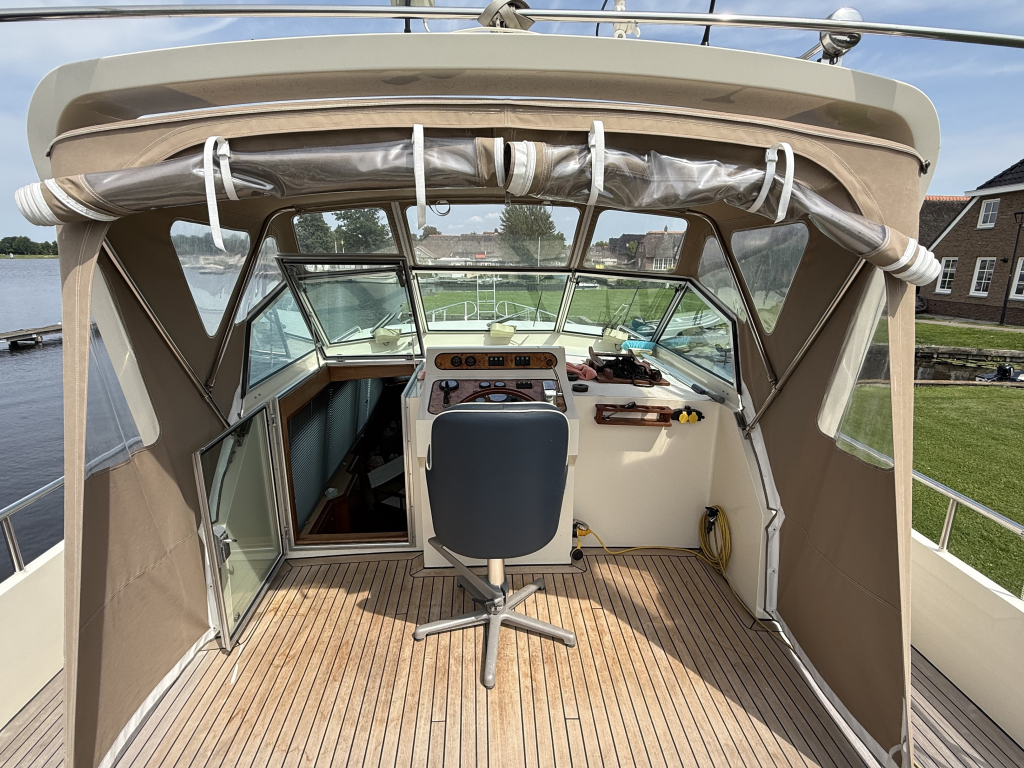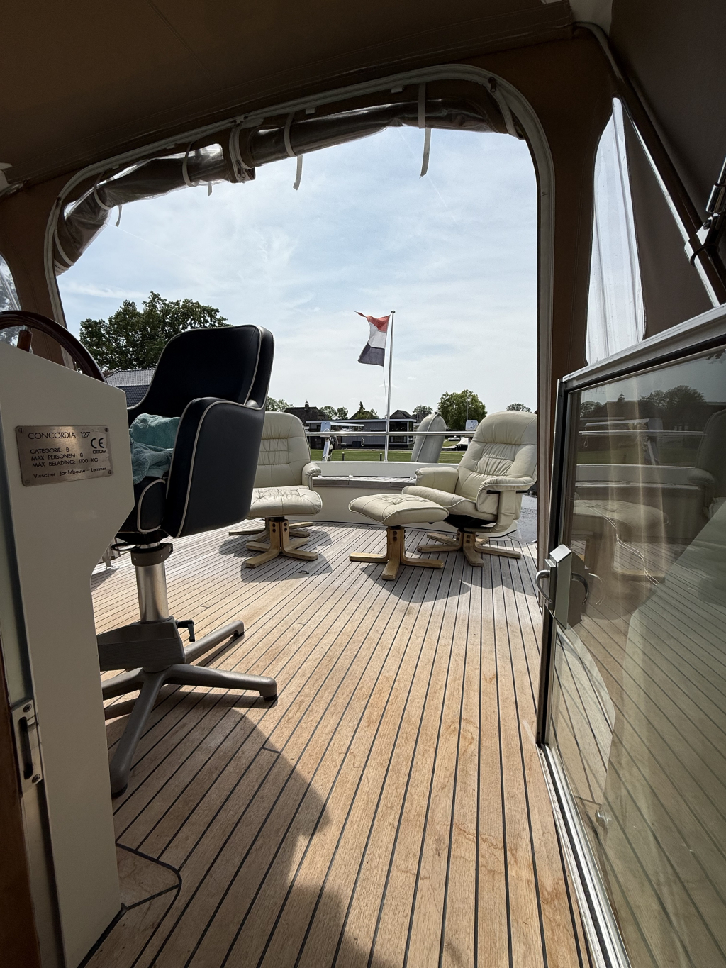 Het achterdek is groot en voorzien van een vaste bank met bergruimte. Het stuurgedeelte is af te sluiten middels een mooie cabriotent. Zonder deze tent is het achterdek en de stuurstand één groot geheel. Voor een bijboot is dit schip voorzien van RVS davits.