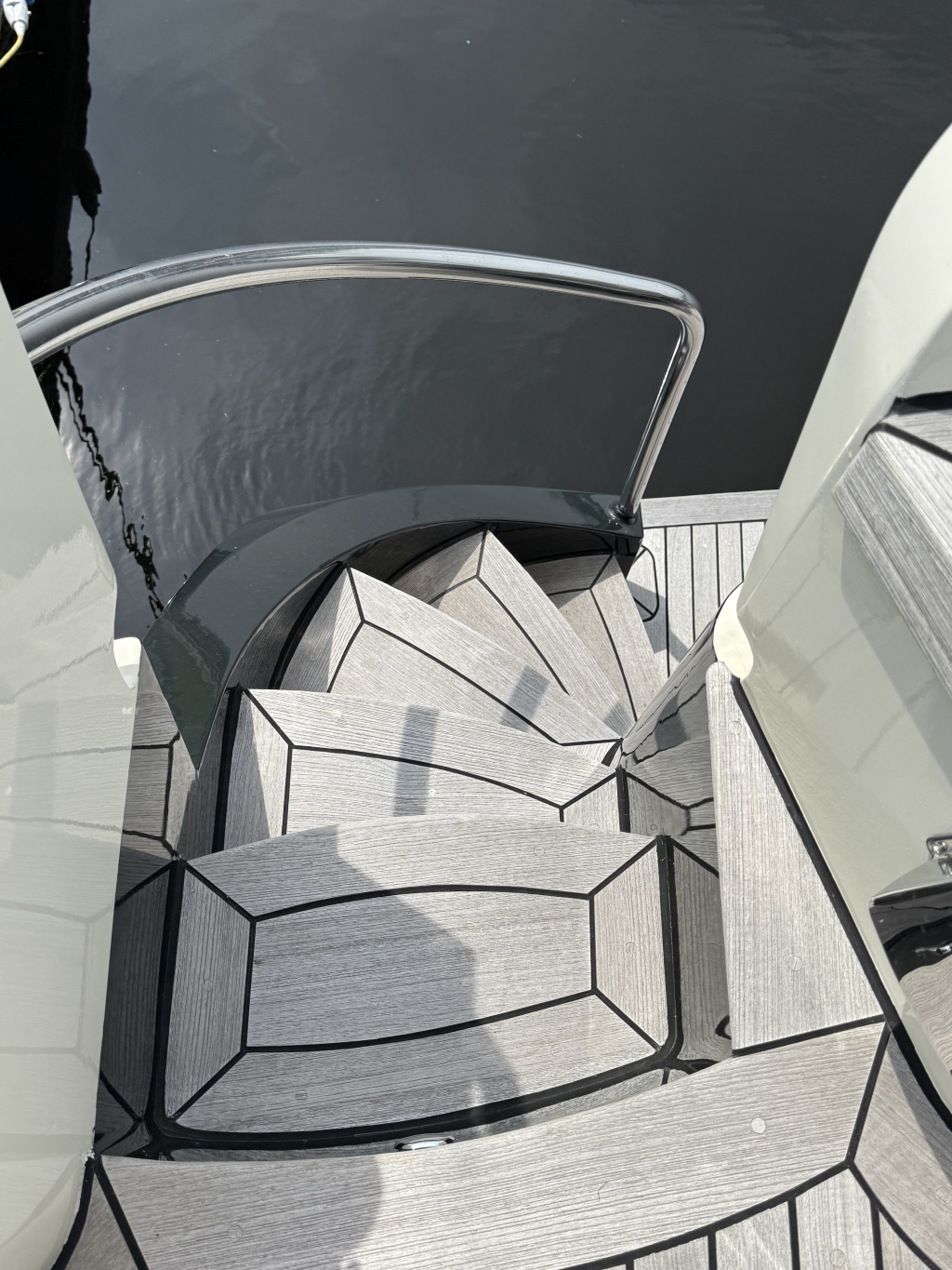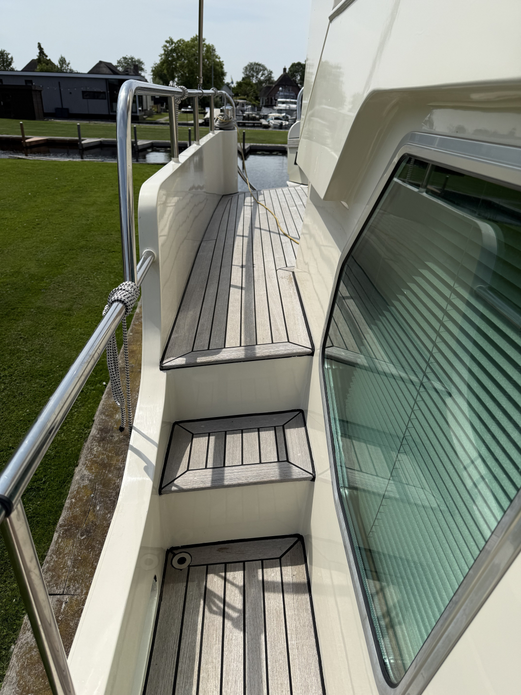 De moderne lijnen lopen door tot en met de spiegel, waar een fraai geïntegreerd zwemplatform is met aan weerszijde een luxe trap met ingebouwde verlichting. Het gehele dek is voorzien van massief teakhout. De gangboorden zijn royaal en geven een veilig gevoel.