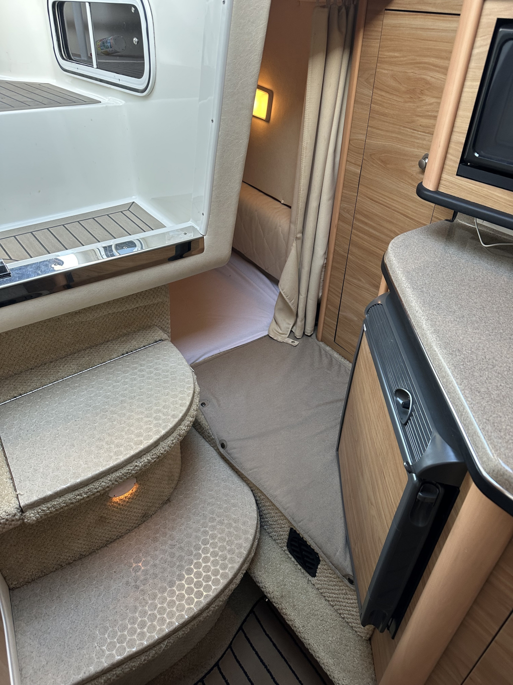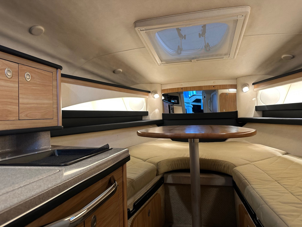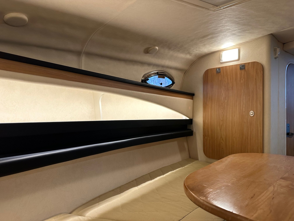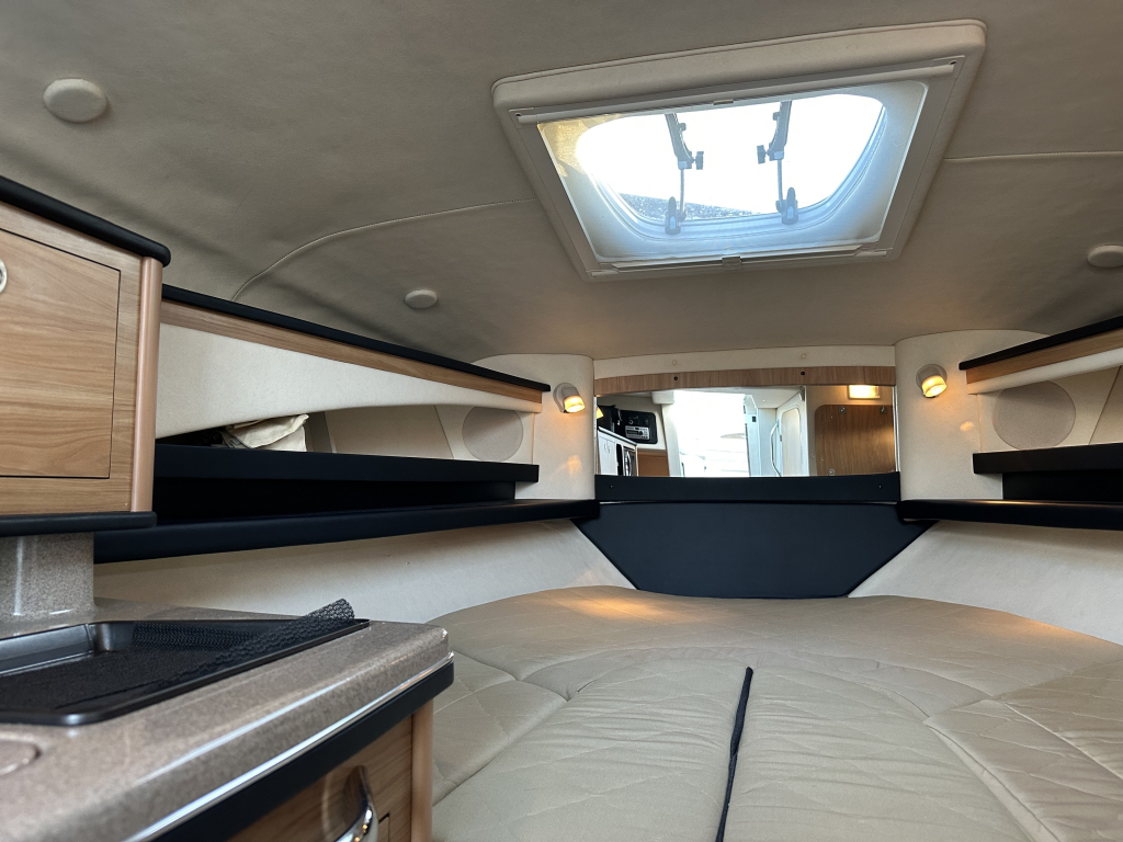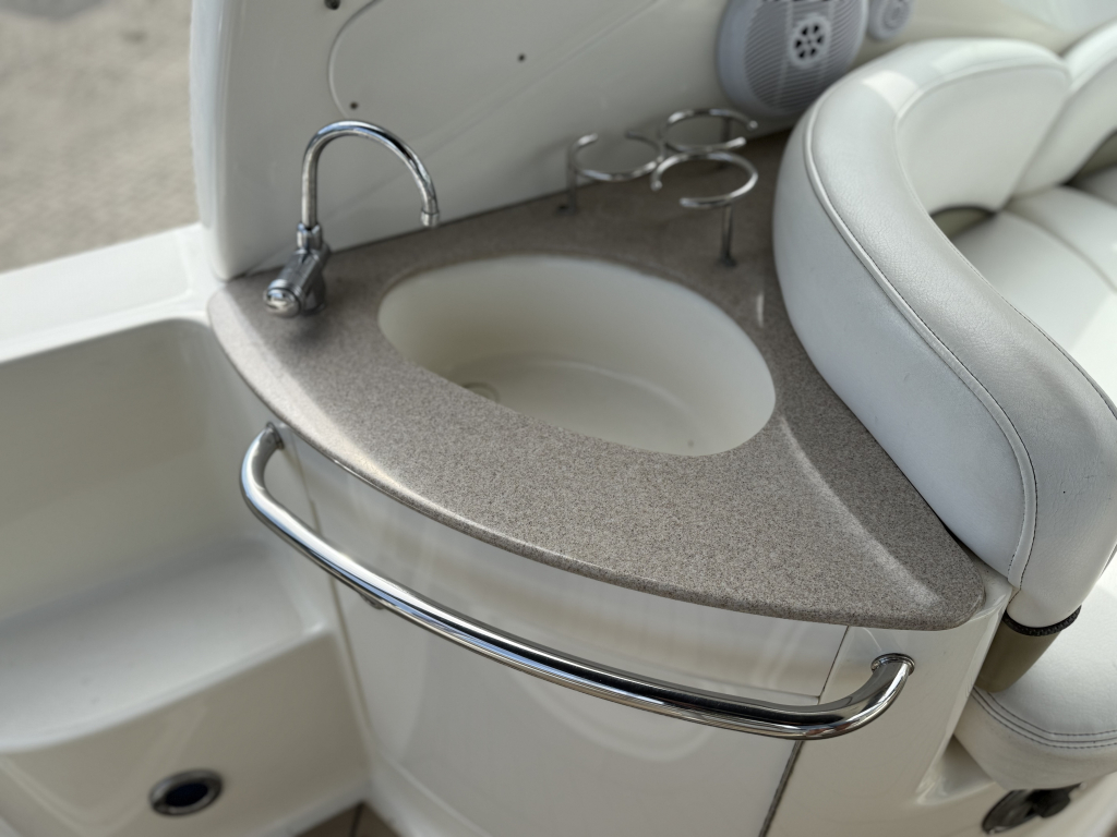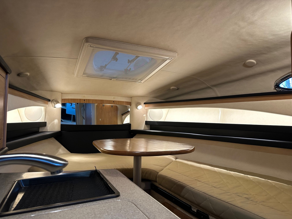 Slank, sportief en veelzijdig, deze 28-voet sportcruiser is ontworpen om alles te bieden wat je nodig hebt voor een weekenduitje of een spontane tour. Stap aan boord en je wordt verwelkomd door een ruime cockpit met royale zitplaatsen, een "wet" bar en een ombouwbare ligstoel — perfect voor vermaak of ontspanning in de zon. Onder dek biedt de goed uitgeruste cabine verrassend veel hoofdruimte, een volledig uitgeruste keuken, een dinette die kan worden omgebouwd tot een V-bed, en een toilet met douche.