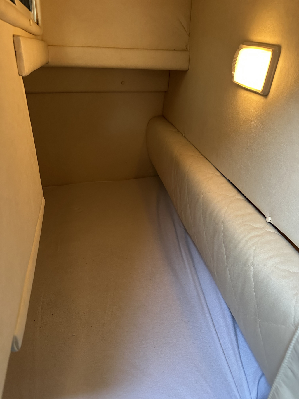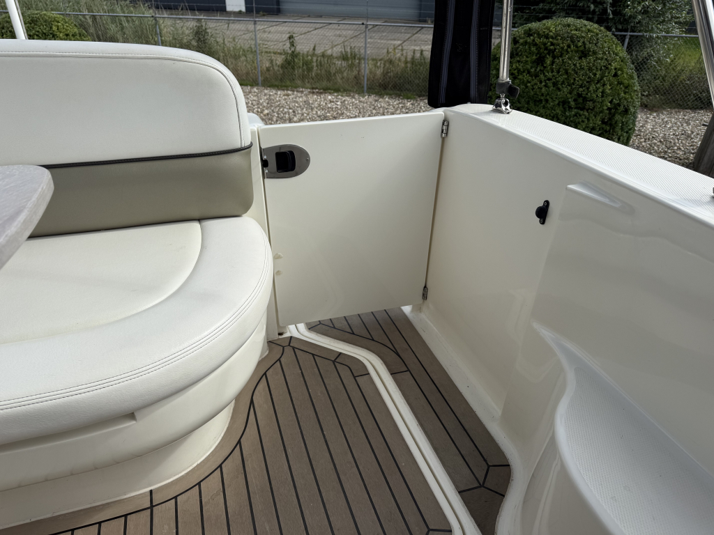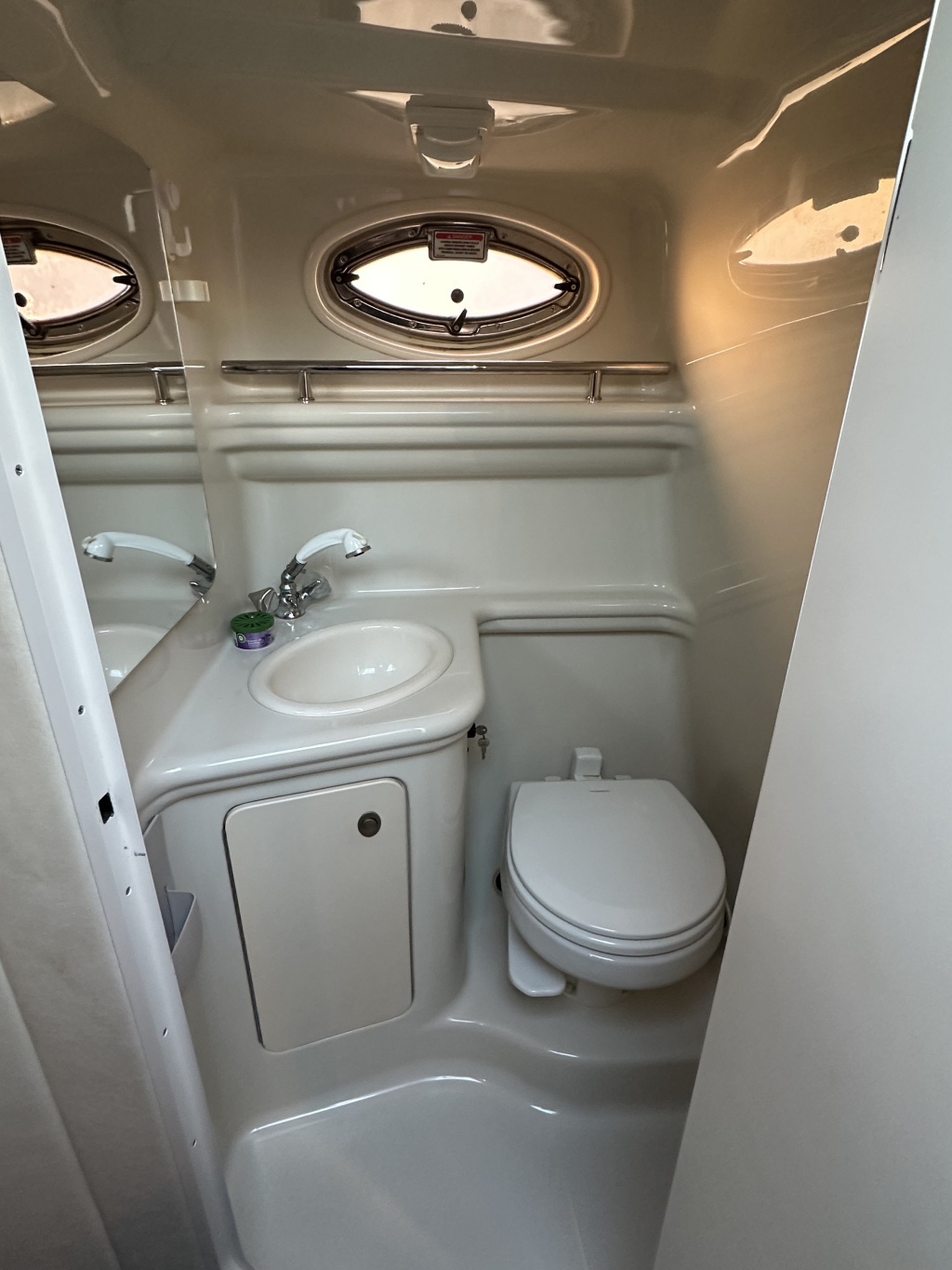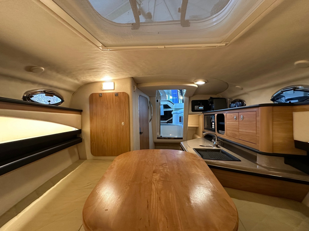Slank, sportief en veelzijdig, deze 28-voet sportcruiser is ontworpen om alles te bieden wat je nodig hebt voor een weekenduitje of een spontane tour. Stap aan boord en je wordt verwelkomd door een ruime cockpit met royale zitplaatsen, een "wet" bar en een ombouwbare ligstoel — perfect voor vermaak of ontspanning in de zon. Onder dek biedt de goed uitgeruste cabine verrassend veel hoofdruimte, een volledig uitgeruste keuken, een dinette die kan worden omgebouwd tot een V-bed, en een toilet met douche.
